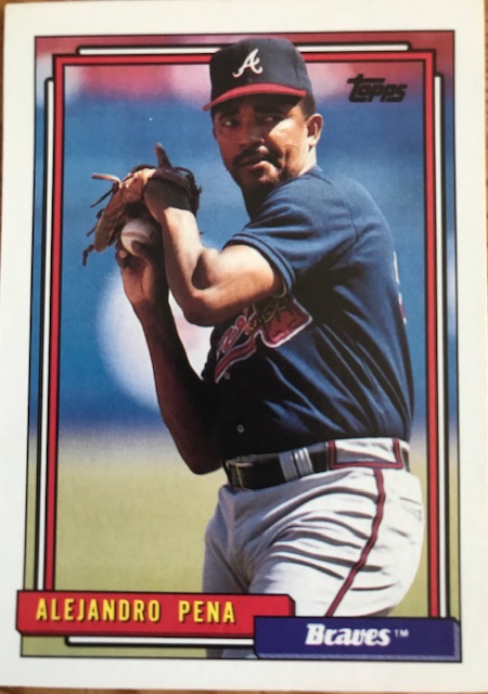 Alejandro Pena’s baseball card interests me also for what happened after his superb 1984 season. Despite leading the league in ERA and going 12-6 with 28 starts that season, Pena would only start 18 more games over the remaining 398 games of his career. He pitched almost exclusively out of the bullpen following shoulder surgery in 1985, and following his brilliant 1988 season for the World Series champion Dodgers in which he had 12 saves, a 1.91 ERA, and won game one of the World Series, the famous Kirk Gibson walk-off, he never made another start. Pena would win another World Series with the 1995 Braves, although he was the losing pitcher in the incredible 1991 World Series game seven when Jack Morris outdueled John Smoltz to win 1-0 in 10 innings.
